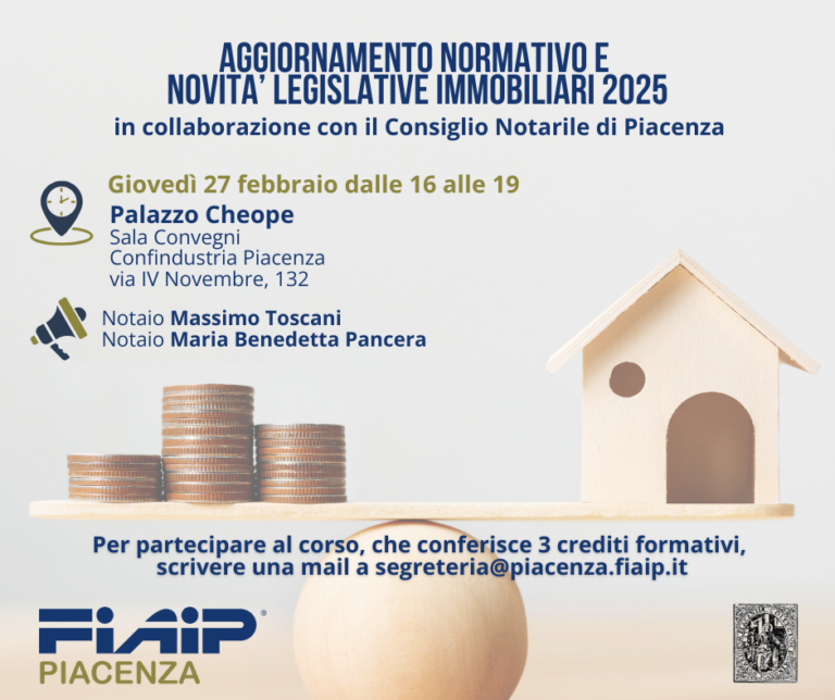 Il Collegio provinciale FIAIP Piacenza è lieto di invitare tutti gli interessati alla presentazione dell'ultima edizione dell'Osservatorio Immobiliare FIAIP Monitora Piacenza e provincia - 1° semestre 2025 Giovedì 25 settembredalle…